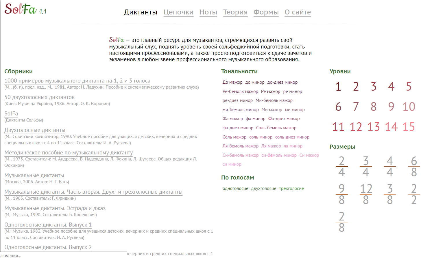 Сайт «SolFa».Один из актуальных Интернет-ресурсов, на котором можно самостоятельно тренироваться в написании диктантов. Выбирая уровень сложности на основе собственного уровня знаний, навыков и умений. Перед диктантом есть запись для настройки в тональности и ноты для самопроверки. Кроме диктантов, есть цепочки аккордов, ноты музыкальных диктантов, теория гармонии и музыкальных форм.