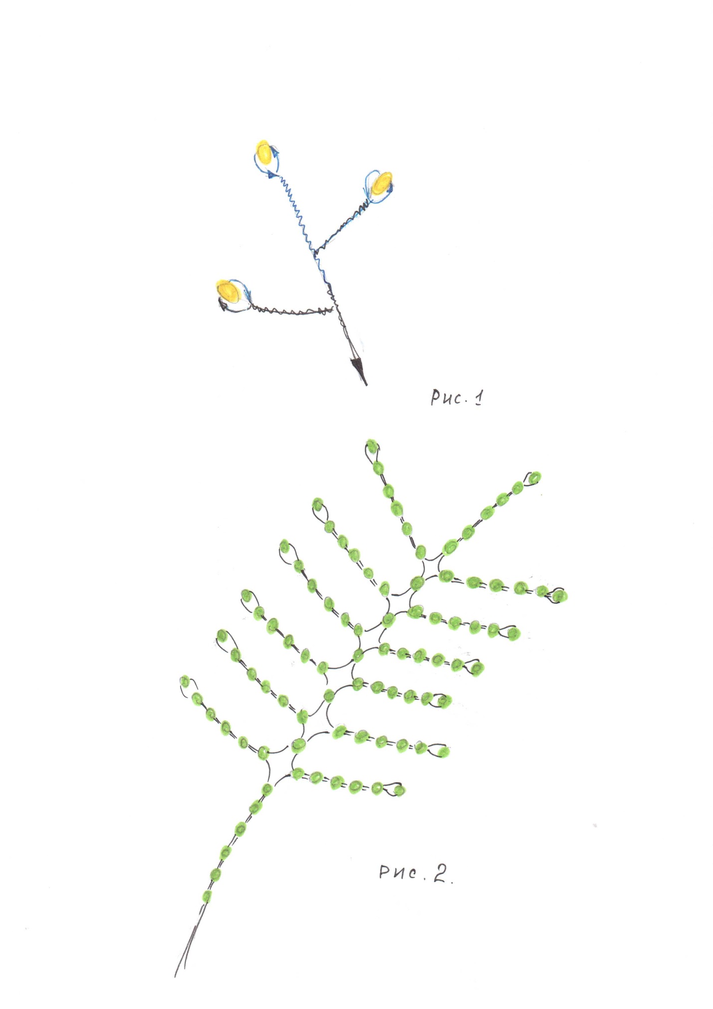 Начинаем изготовление с листочков (рис. 2) (зелёный бисер). Используем технику «Игольчатого плетения».