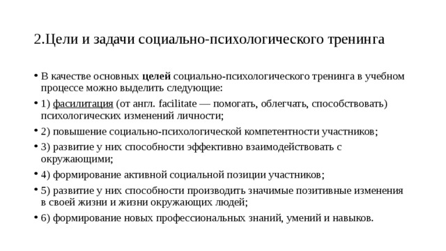 Цель социально-психологического тренинга заключается в развитии коммуникативной готовности личности и формировании умений, обеспечивающих успешное взаимодействие в различных социальных ситуациях. Тренинг способствует побуждению к личностным изменениям, которые проявляются в реальной жизни, создавая условия для становления уверенности, адаптивности, креативности и психологической устойчивости в коммуникации. Также важной целью является развитие гуманистической установки в отношении партнёров по общению и осознания общения как самостоятельной ценности, что усиливает социально-психологическую активность участников и способствует улучшению их состояния через повышение компетентности во взаимодействии с людьми [5].