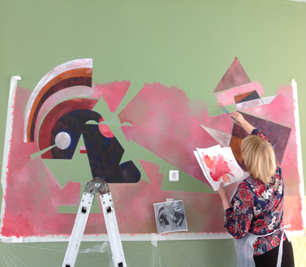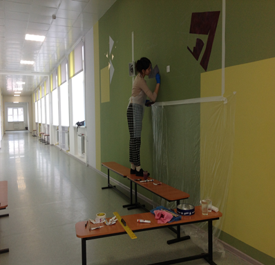 3. По готовому эскизу мелом на стене начала выполнять роспись акриловыми красками первого слоя.