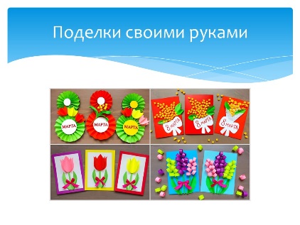 - создать творческие проекты к 8 Марта на основе полученных представлений о традициях празднования Международного женского дня.