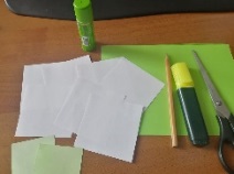 | 7. Выровнять лист и зафиксировать его с другой стороны | 8.Взять лист зеленой бумаги | 9.Скрутить из него стебель
