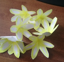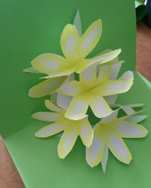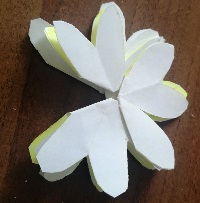 | 16. Сложить пополам 1 цветок, нанести на кончики крайних лепестков клей, соединить их с 2 и 3 цветком
