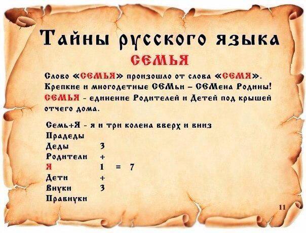 Слово «семья» произошло от слова «семя.» Действительно, слово СЕМЬЯ, которое происходит от слова СЕМЯ (имеет связь с продолжением рода) - это 7 раз «Я», три поколения в прошлое (родители, деды, прадеды) и три поколения в будущее (дети, внуки, правнуки).