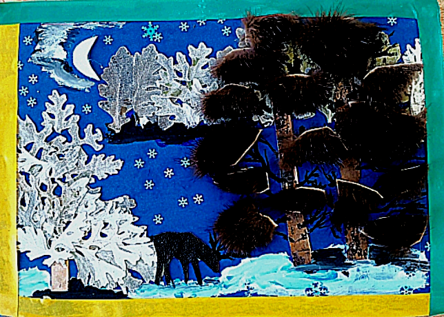 14. Осталось доделать немного. Из фомирана вырезам месяц или луну. Приклеиваем на небе. Также , по желанию приклеиваем декоративные снежинки.