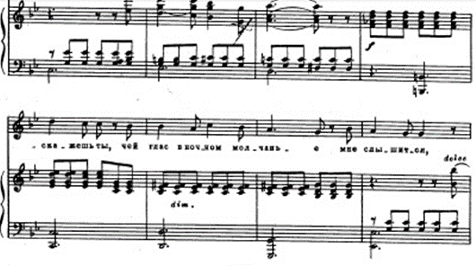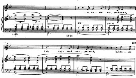 - привнесение мелодического движения в гармонические голоса, приводящее к полифоничности сопровождения (С.В. Рахманинов «Сирень»)
