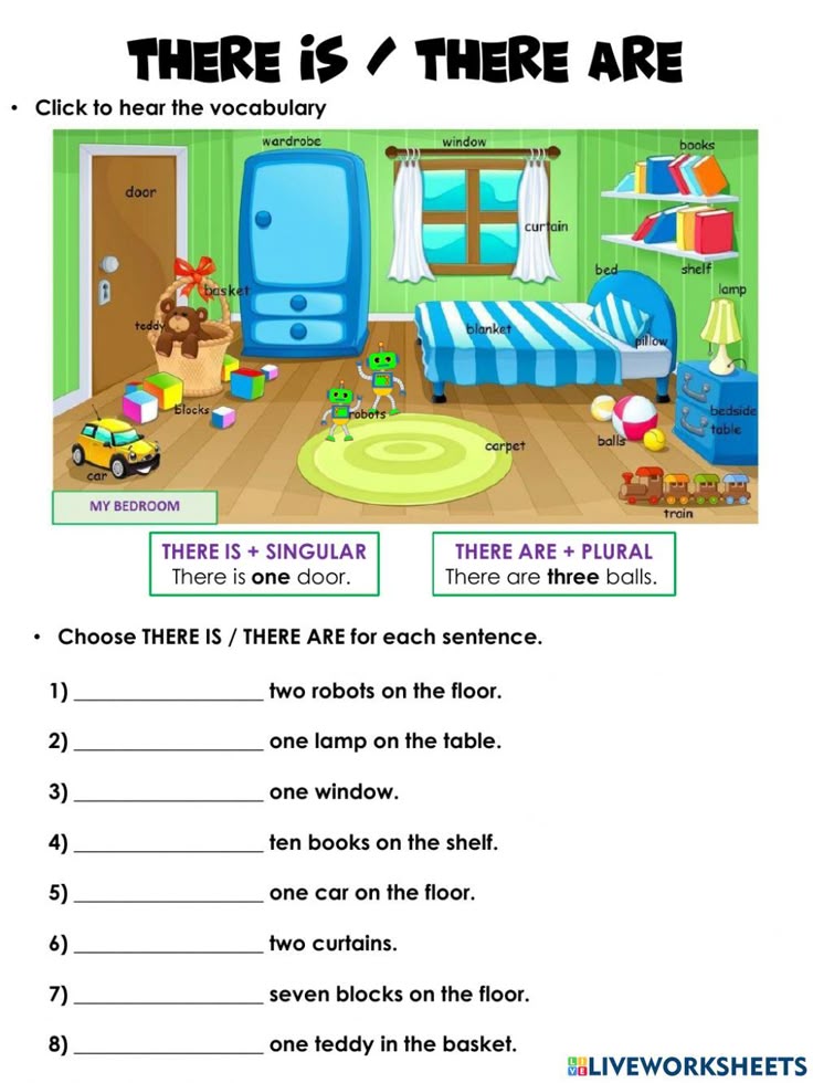 Педагог: Ребята, а что еще нам необходимо, чтобы описать комнату…Вы правы, для описания дома или квартиры мы можем использовать грамматическую конструкцию thereis / thereare (что-то находится где-то), а также предлоги места (prepositionsofplace).Now I will hand out some worksheets. There you have to choose there is or there are and the right preposition of place.