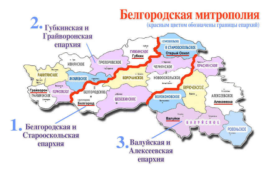 Кафедральные соборы: Свято-Николаевский собор в городе Валуйки и Свято-Троицкий собор в городе Алексеевка.