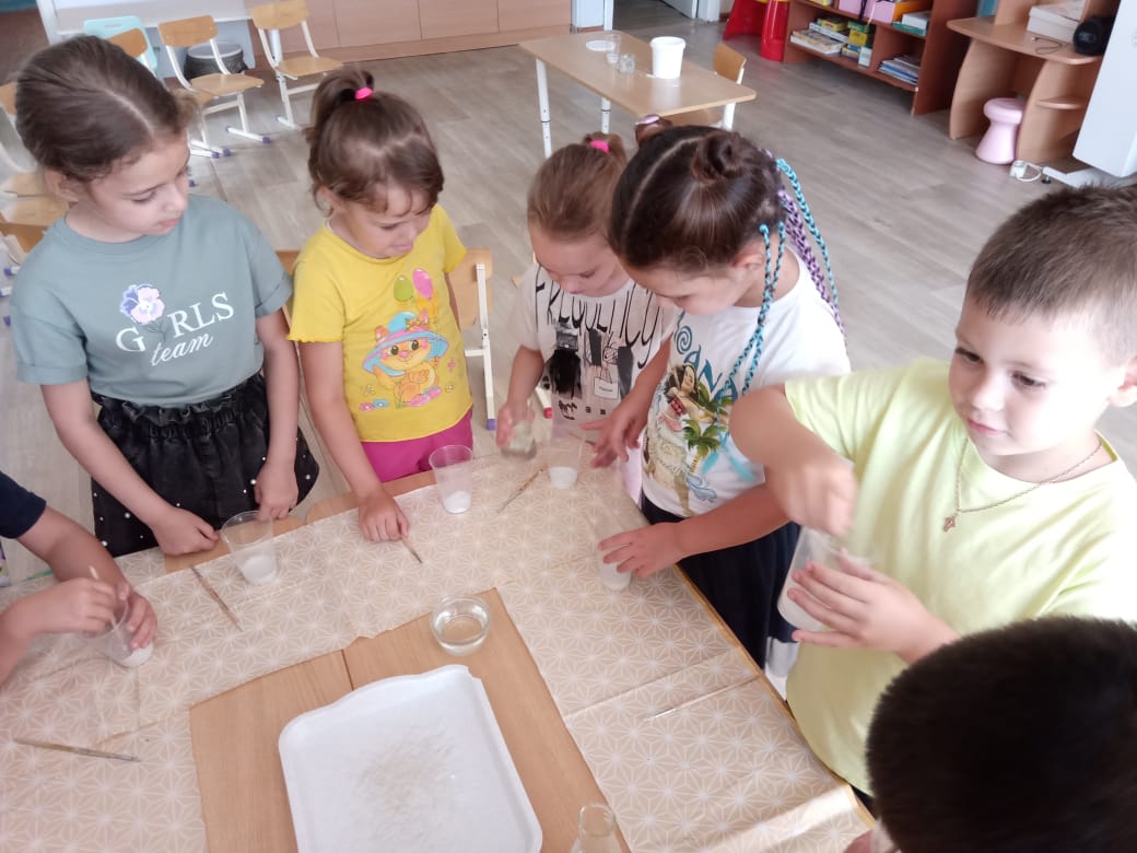 Для начала экспериментных действий педагог предлагает налить воду в емкость и подкрасить ее гуашью. Затем постепенно в эту воду засыпаем гипс.