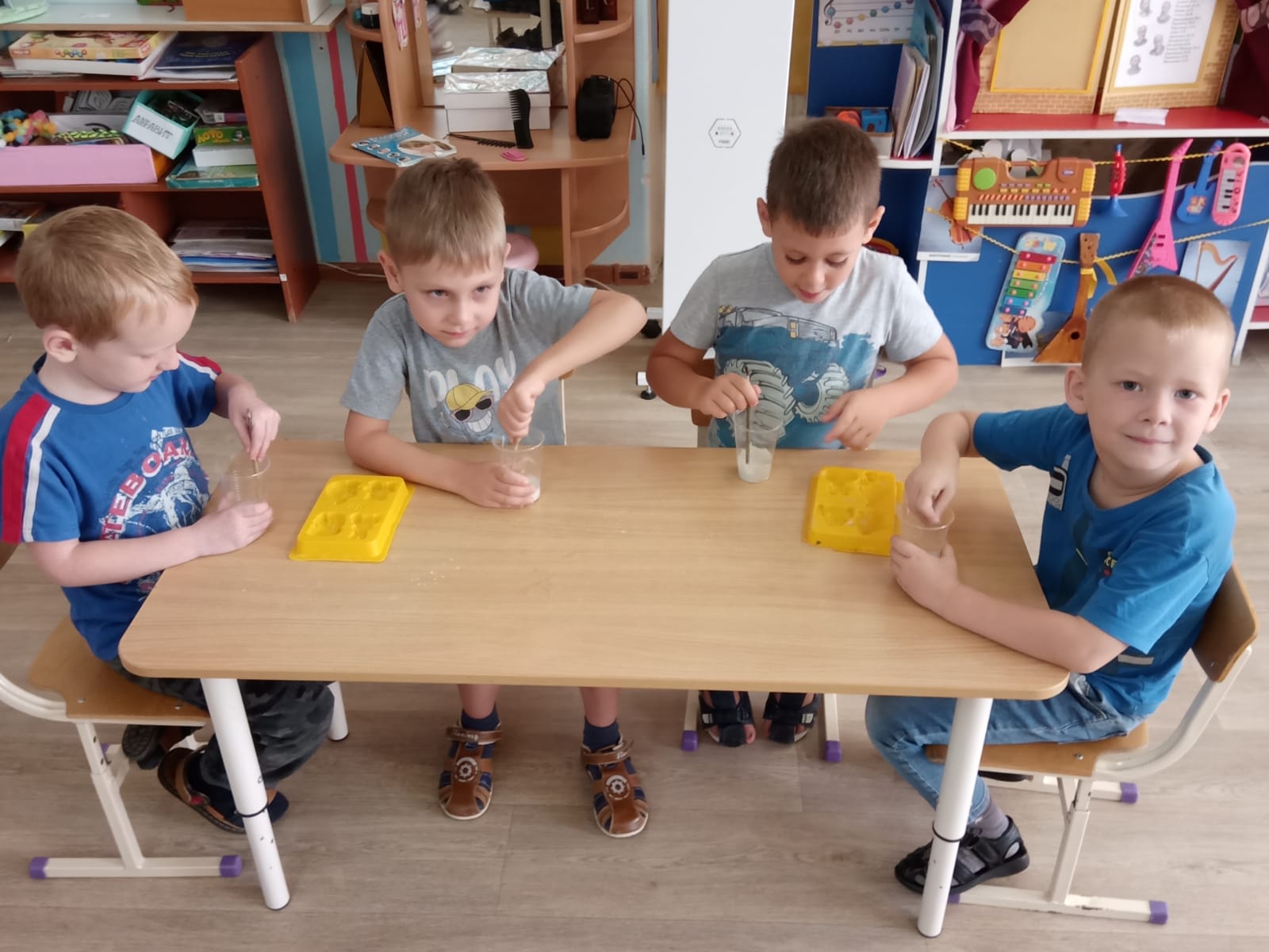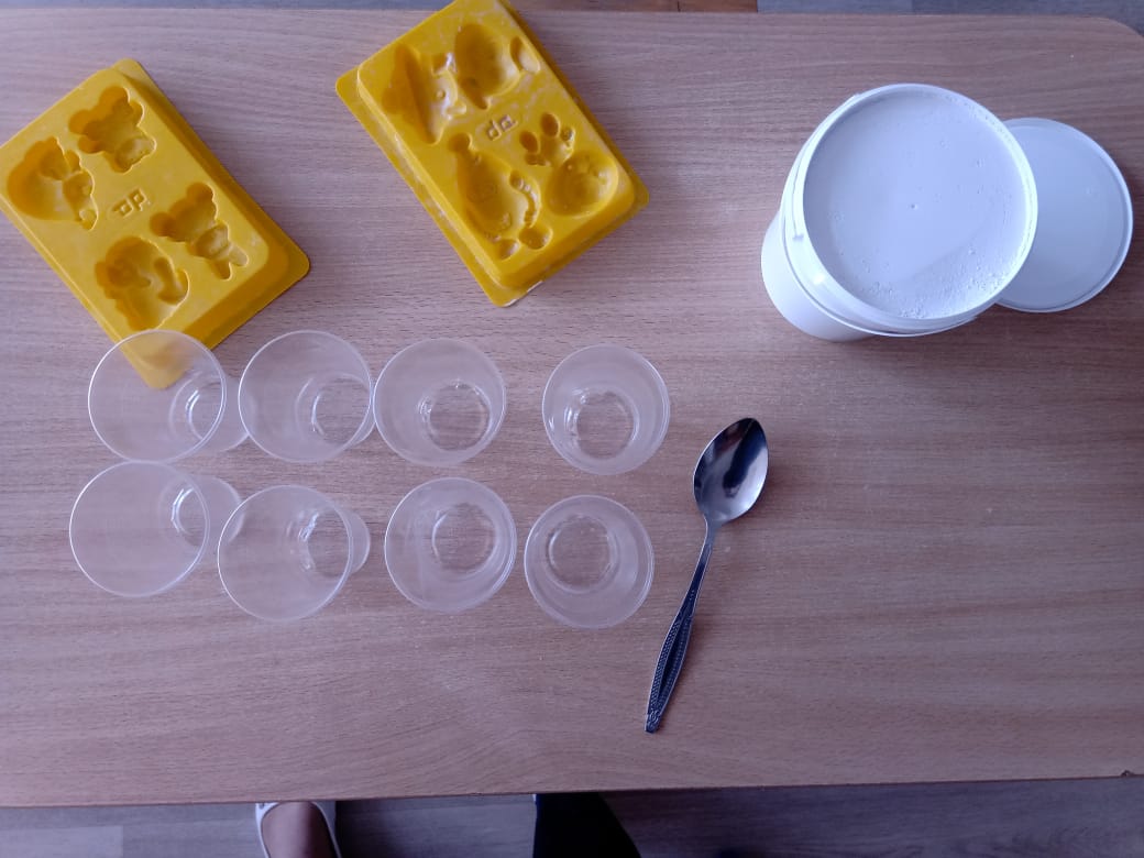 Отметив такие изменения, педагог предлагает продолжать эксперимент и разлить содержимое емкости в формочки (если используются не силиконовые формочки, а, например, пластмассовые, то их предварительно следует смазать маслом или вазелином. Иначе будет проблематично вынуть заливку).