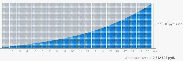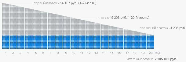 Каждый платёж выплачиваются разные суммы. Каждый раз клиент платит набежавшие проценты за 1 период и 1/n часть основного долга, где n – период, на который взят кредит (количество месяцев, лет). При такой схеме платежа наибольший платёж – первый, наименьший – последний.