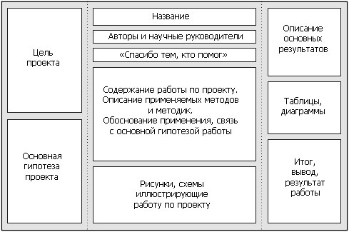содержание и композиция защиты-презентации определяется авторами самостоятельно, однако в выступлении должны быть освещены следующие вопросы: актуальность и обоснование выбранной темы; цели и задачи проекта, степень их выполнения; краткое содержание, ключевые положения и выводы; этапы выполнения проекта, распределение обязанностей между участниками; обязательное определение степени самостоятельности в разработке и решении поставленных проблем; рекомендации по возможной сфере практического использования проекта;