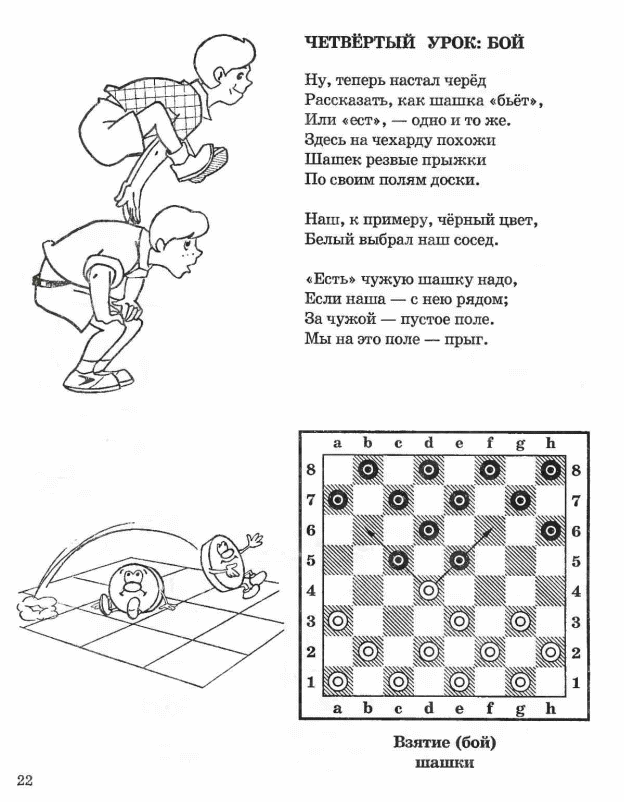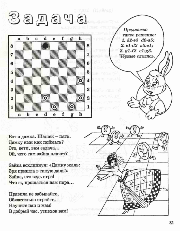 | «Зайкины шашки» урок 2, 3 (понятие шашки, расстановка шашек на шашечной доске) Чтение стихотворения "Правило игры" 1) Начинать бой можешь смело – Первый ход всегда за белой! 2) Шашки медленно, но метко Шагают лишь по черным клеткам! 3) Наверно, шашкам не везет, Что ходят шашки лишь ВПЕРЕД! 4) Знают все : и стар, и млад, Шашкой бьем вперед – назад! 5) Шашка соперника сразу погибнет, Если твоя ее перепрыгнет! 6) Поля вдруг конец настанет, Сразу шашка «дамкой» станет! 7) Чтоб твою «дамку» не поймали, Ход ее по всей диагонали! 8) Цель игры – побить «врагов» И чтоб им не было ходов! ПРАВИЛА ИГРЫ В ШАШКИ «Что общего?» Педагог берет две шашки и спрашивает детей, чем они похожи друг на друга, чем отличаются? (Можно использовать шашки разного цвета, размера). «Да или нет?» Перед детьми доска с расставленными на ней шашками. Педагог произносит фразу о положении шашек на доске, к примеру: «Белая шашка стоит в правом верхнем углу», и передаёт свободную шашку кому-то из детей. Если утверждение верно, то шашку следует взять, если нет, то поставить предложенную шашку на новую позицию и назвать её. Игра «Смотрите внимательно». На произвольном отрывке шашечной доски расположить фишки произвольно. Дать посмотреть внимательно, а затем на своих карточках дети должны расставить фишки по памяти. Игра «Зеркало». Дети должны выложить фишки в зеркальном отображении. | Упрощение: «Собери пазлы». Дети должны собрать произвольно разрезанную шашечницуУсложнение: Решение простейших комбинаций | Программа ДОУ, интернет ресурс В. К. Погрибной, В. Я. Юзюк «Шашки для детей» «Зайкины шашки», Е.М.Юровский, Л.П.Кондратьева | |