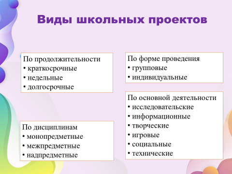 И мы видим на экране. Виды школьных проектов.