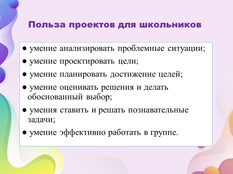 Польза проектов для школьников. Осваивая способы проектной деятельности, учащиеся смогут развить умения, которые будут полезны им в жизни, чем бы они не занимались, это: