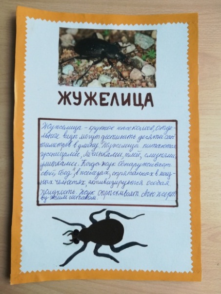 Жужелица – крупное насекомое, отдельные виды могут достигать десяти сантиметров в длину. Жужелицы питаются гусеницами, личинками,тлей, слизнями, улитками. Когда жук обнаруживает свой «обед», в железах, спрятанных в мощных челюстях, активизируется особая жидкость. Жук опрыскивает свою жертву этим составом, выжидает несколько минут и затем принимается за пищу. (Белозорова М.)