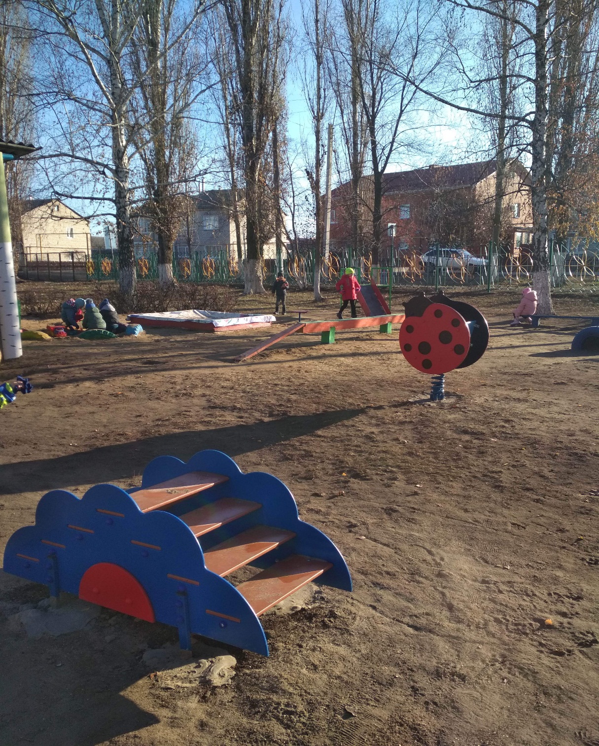 Весной установили ограждение. Посадили за оградой пирамидальные тополя, чтоб защитить участок от ветра во время прогулки. Разделили территорию на групповые участки. С помощью шефских организаций изготовили горки, игровое оборудование, качели, самолеты, машины из дерева, песочницы, веранды расписали сами воспитатели. Для благоустройства территории асфальтный завод выделил асфальт и ручной каток. Поэтому устраивали субботники, порой выходили асфальтировать дорожки в сон, оставляя дежурных на этажах