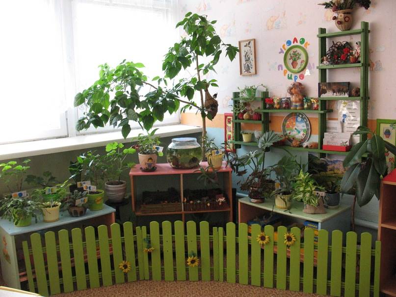 | Живой уголок, в котором находятся комнатные растения: герань, бегония, алое, фикус, каланхоэ; а также животные: рыбки и черепаха. |