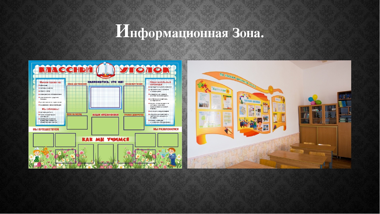 Информационная зона располагается по периметру классной комнаты и обычно представлена стендами на стенах. Содержание стендов отражает жизнь России, края, города, класса, воспитывая патриотические чувства у маленьких школьников. Стенды оформляются в цветном варианте, что притягивает взор детей, вызывая желание познакомиться с информацией.