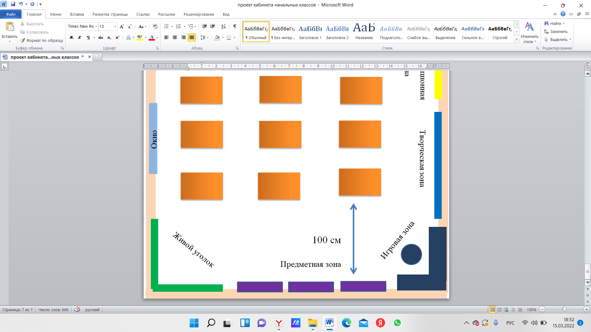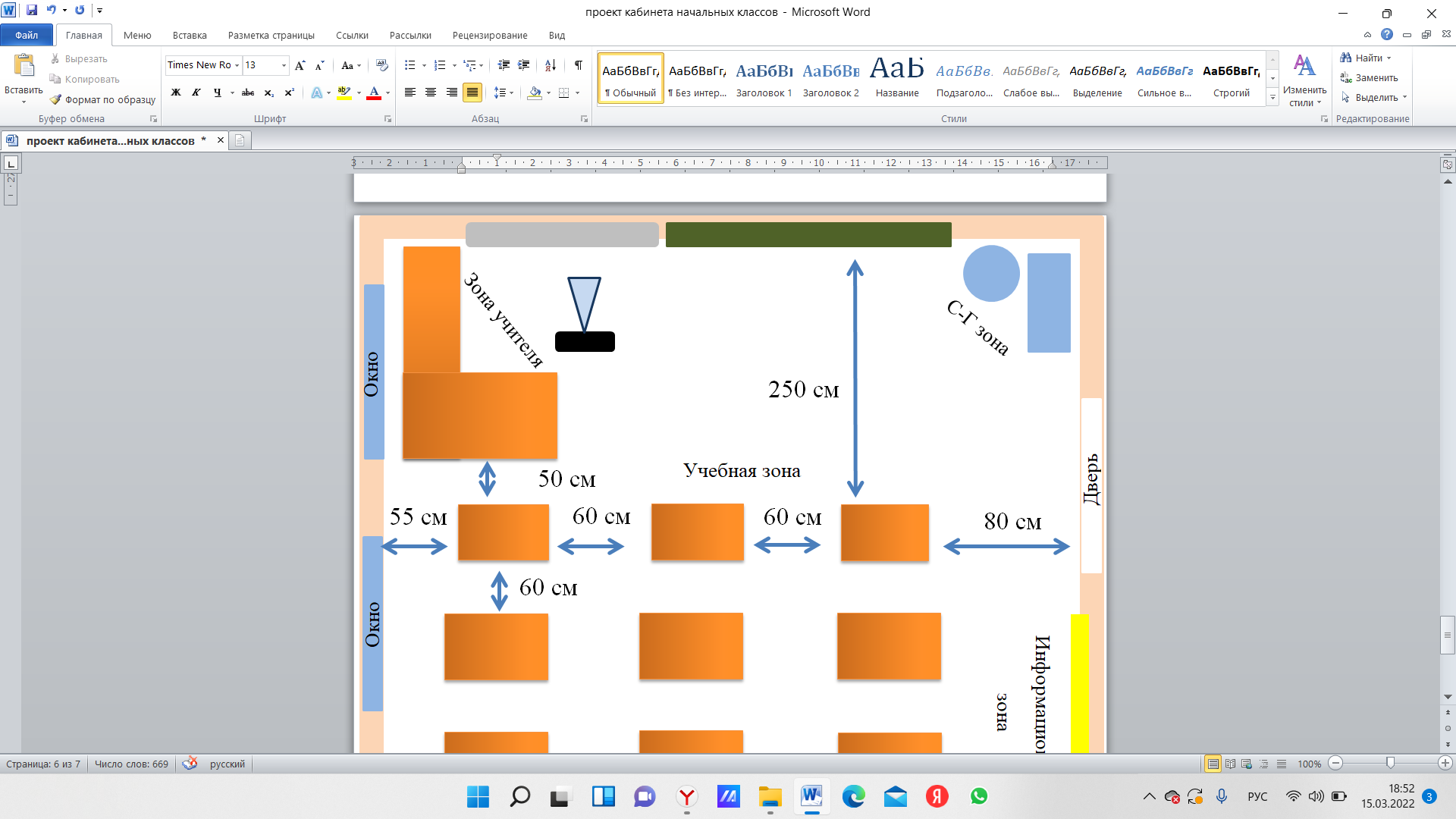В учебной зоне расположены парты, учительский стол, учебная доска, телевизор и видеомагнитофон, книжный шкаф. Пространство должно сочетать строгость и комфорт, которые обеспечиваются определенным расположением предметов и подбором цветовых предпочтений. Требования представленные к учебной зоне, вы можете увидеть на примерной схеме учебного кабинета.