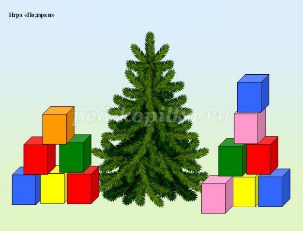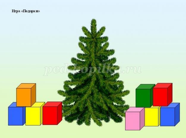 Цель: поощрять стремление поздравлять близких с праздником, преподносить подарки. Формировать эмоционально положительное отношение к наступающему новому году, украшать елку.