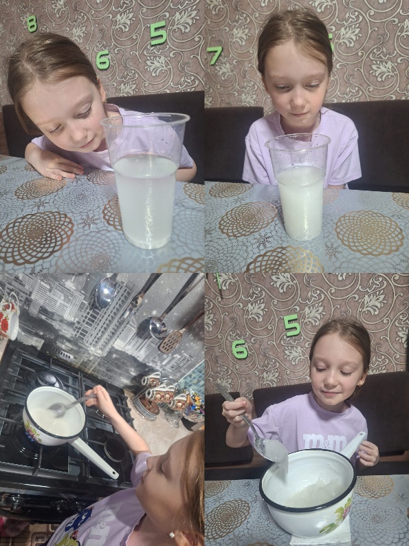 Далее я нагрела эту суспензию при постоянном помешивании, она загустела. Получился клейстер, это свойство крахмала используется для склеивания, для накрахмаливания белья, при приготовлении желе, киселя и других блюд.