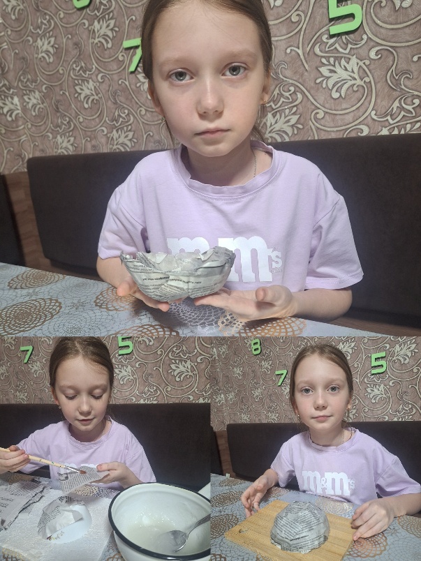 Сначала мы разорвали газетки на мелкие кусочки, взяли миску и обклеили ее кусочками газет, намазывая клейстером между слоями. Положили сохнуть на подоконник. Когда заготовка засохла, она затвердела и стала похожа на миску, которую мы обклеивали.