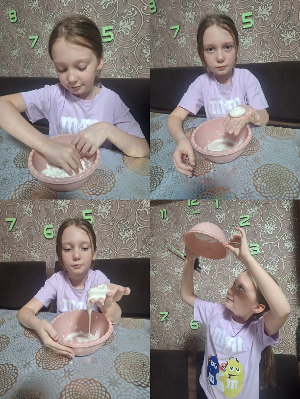 В емкость наливаем воды (1(вода):3(крахмал)), добавляем крахмал, все это хорошо перемешиваем. Я размешивала ложкой, было очень тяжело, потом стала перемешивать руками. Но тут такая странность, ничего не перемешивается. Если взять ее в руку и сильно сжимать – она станет твердой и можно даже слепить из нее шарик, но как только останавливаемся – она стекает обратно в миску сквозь пальцы. При опрокидывании миски ничего не произошло, жидкость осталась в ней. Я кинула в миску лошадку, она с легкостью скакала по поверхности, а как только останавливалась – тонула, как в болоте. Мы нашли в интернете видео, что в столице Малайзии Куала- Лумпур есть бассейн, его наполнили 8 тоннами крахмала и воды, там люди ходят по воде!