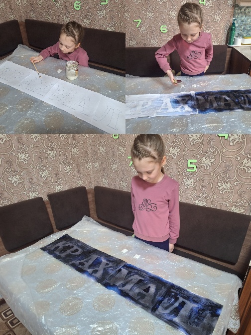 Ватман обработала смесью воды с крахмалом, кроме отдельных частей, где написано название « КРАХМАЛ». Взяла распылитель и побрызгала на него раствором воды с йодом. В результате, название моей работы «КРАХМАЛ» выглядит как буквы на фиолетовом фоне.