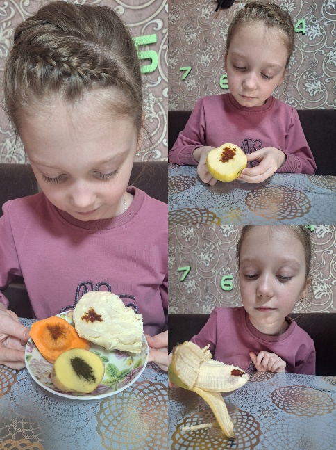 При проведения опыта я капнула по капле йода на продукты представленные в таблице. Йод при контакте с крахмалом, содержавшемся в продукте сталсине-фиолетовым.