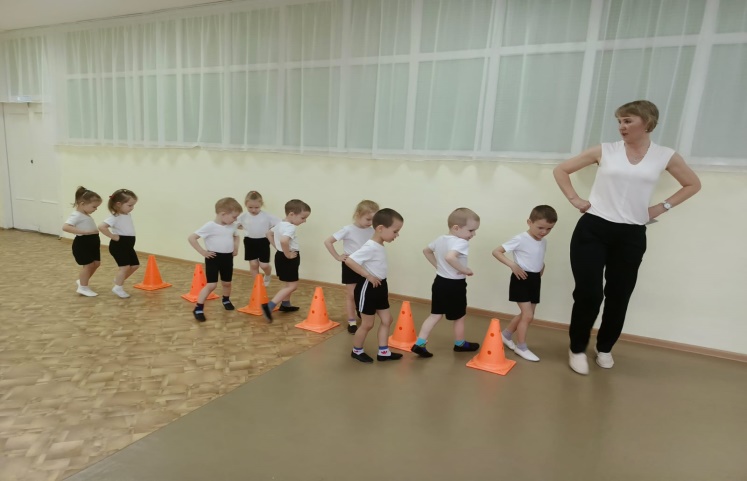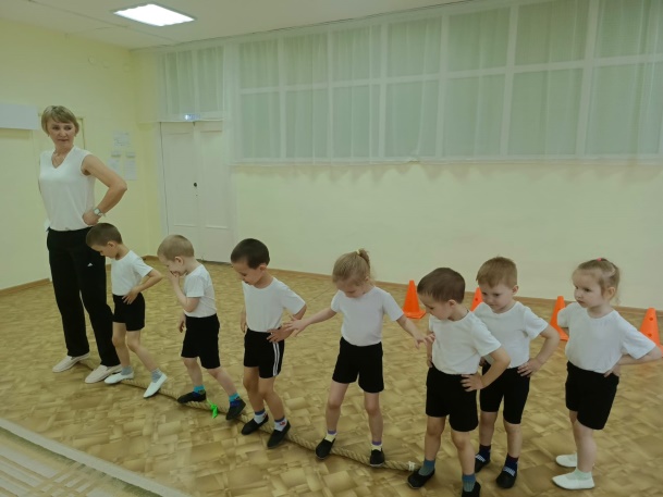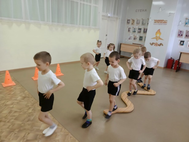 (в зале до ковра расставлено спортивное оборудование для разминки: 6 конусов, извилистая дорожка, канат).