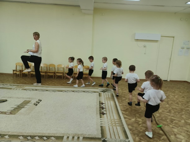 (в зале до ковра расставлено спортивное оборудование для разминки: 6 конусов, извилистая дорожка, канат).