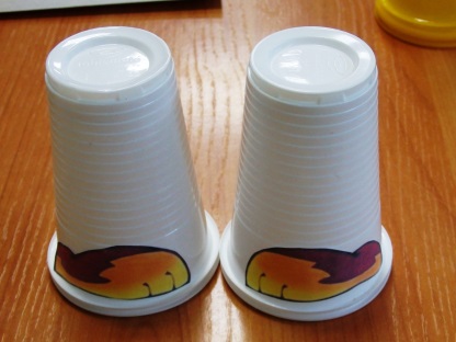 Для поделки понадобились материалы: лист картона, пластиковые стаканчики, распечатки героев (Приложение №5, №6), остатки тесьмы, лент.