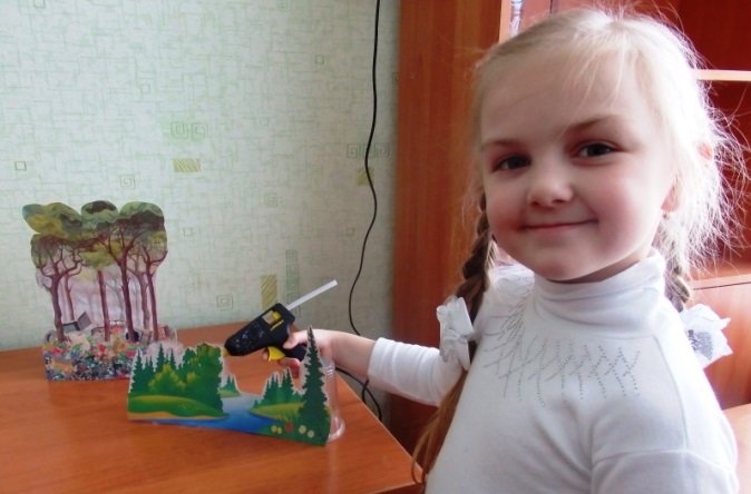 За 4 месяца (октябрь, ноябрь, декабрь, январь) нам удалось собрать много стаканчиков, мы их помыли и высушили. Приготовили клей-пистолет, клей-карандаш, ножницы, картон, нашли распечатки героев и декораций сказки «Теремок» в интернете. И работа закипела.