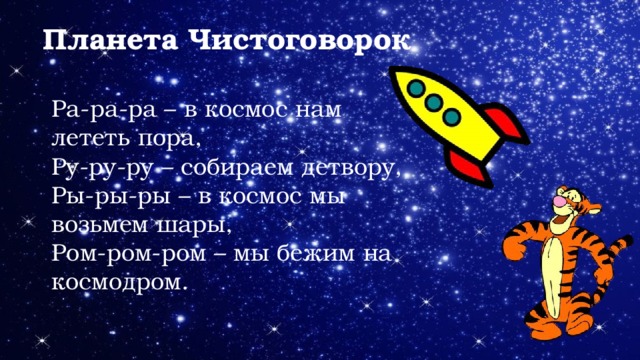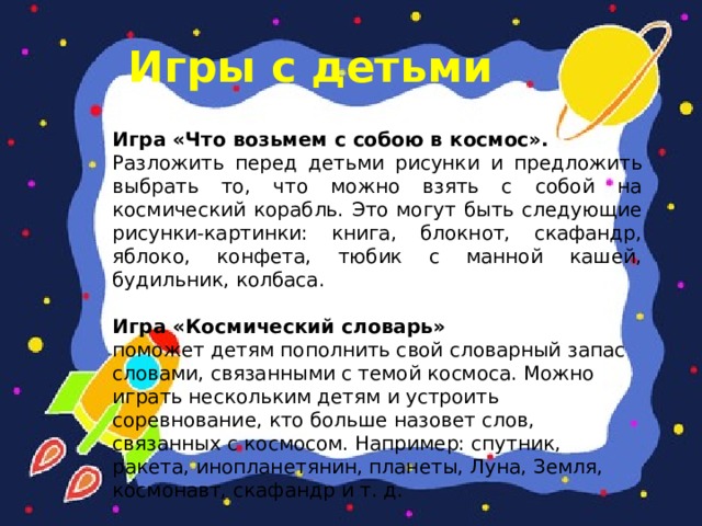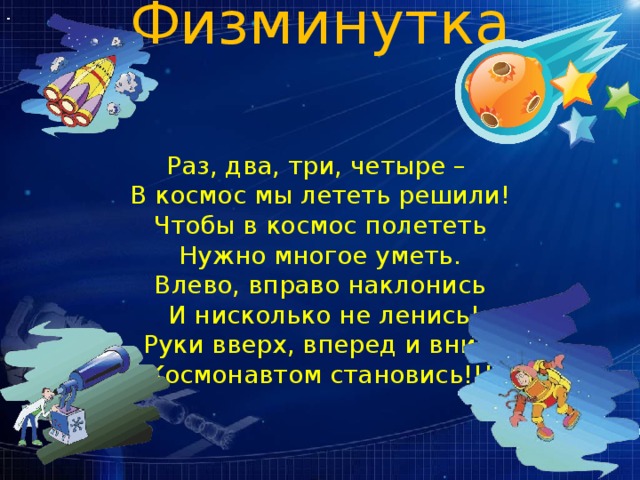 - активизировать в речи детей слова: космос, космонавт, планеты, комета;