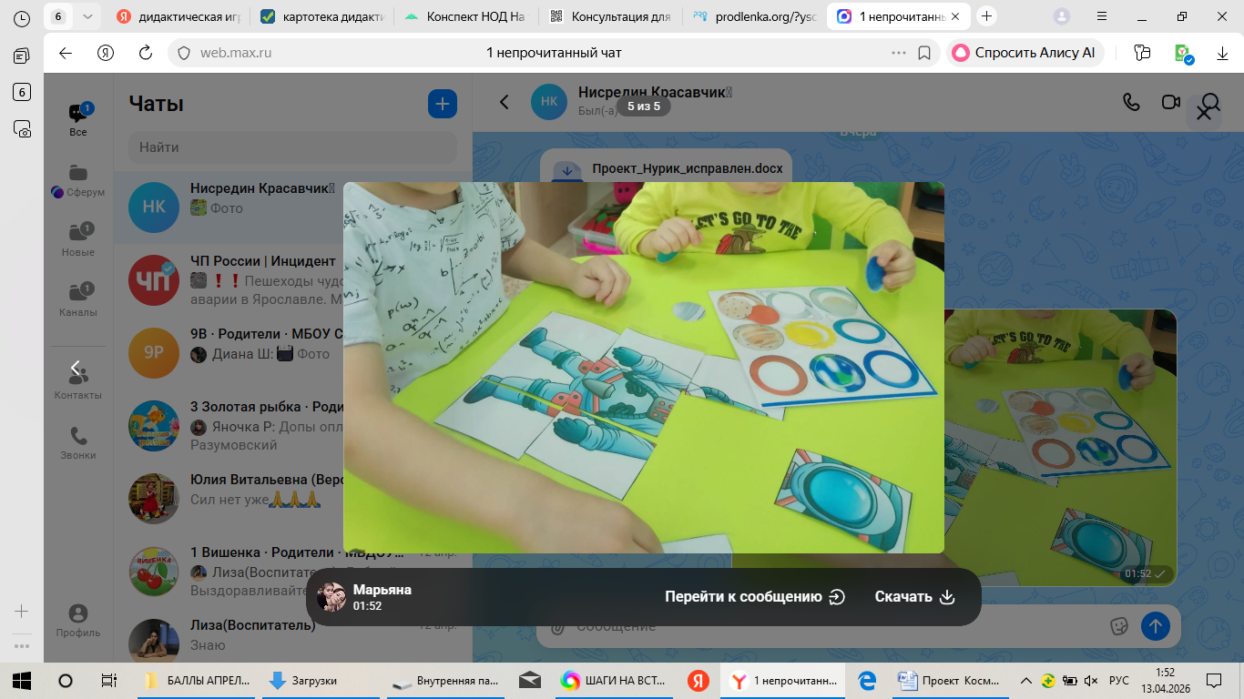 Среда 8.04.2026 | Речевое развитие | Пальчиковая гимнастика «Солнышко светит» Дидактическая игра "Подбери планеты по рисунку» | Развивать мелкую моторику. Учить детей зрительно анализировать картинки и находить нужные рисунки. Развивать зрительное восприятие, логическое мышление, память, наблюдательность. |
