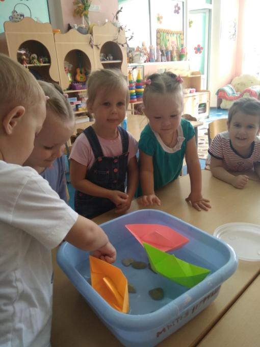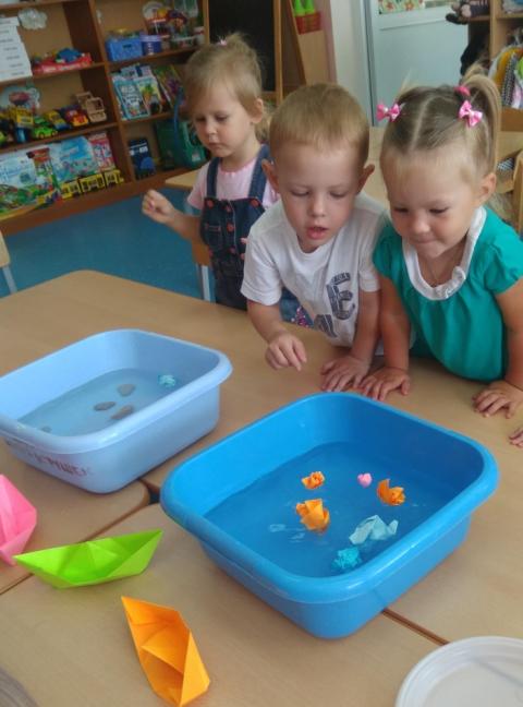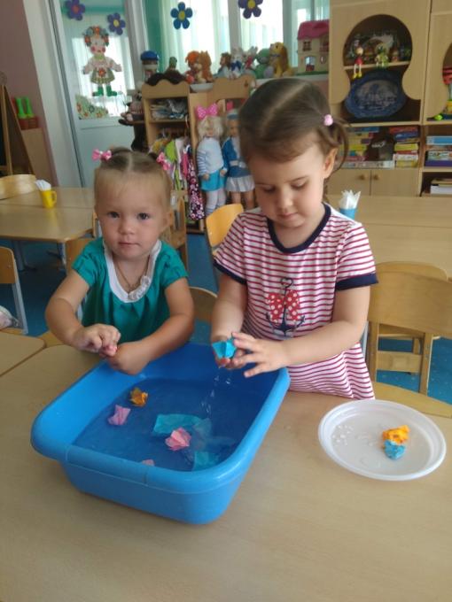 В процессе работы, играя с детьми, стараемся создавать проблемные ситуации, позволяющие ребенку делать какие-то самостоятельные выводы. С помощью игрового персонажа предлагаем детям простейшие проблемные ситуации:«Зачем нужна вода?»,«Что поплывёт, что утонет?» и т.д.