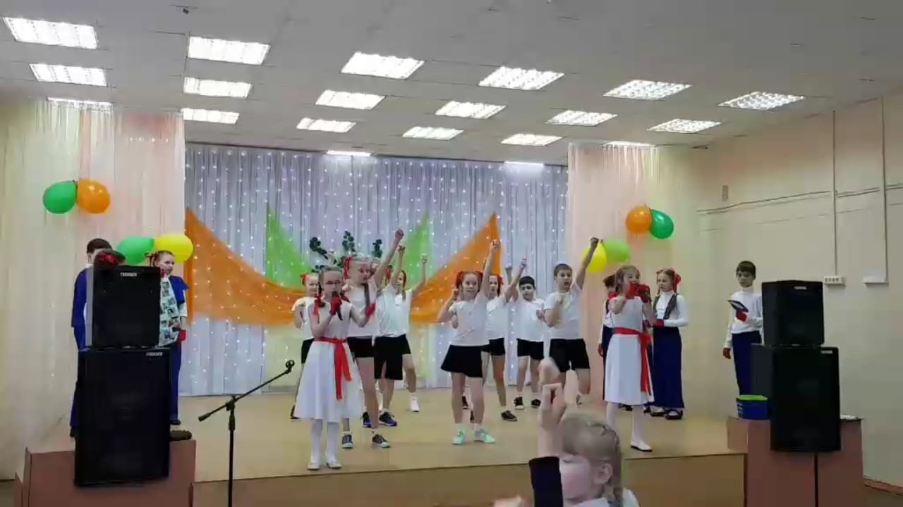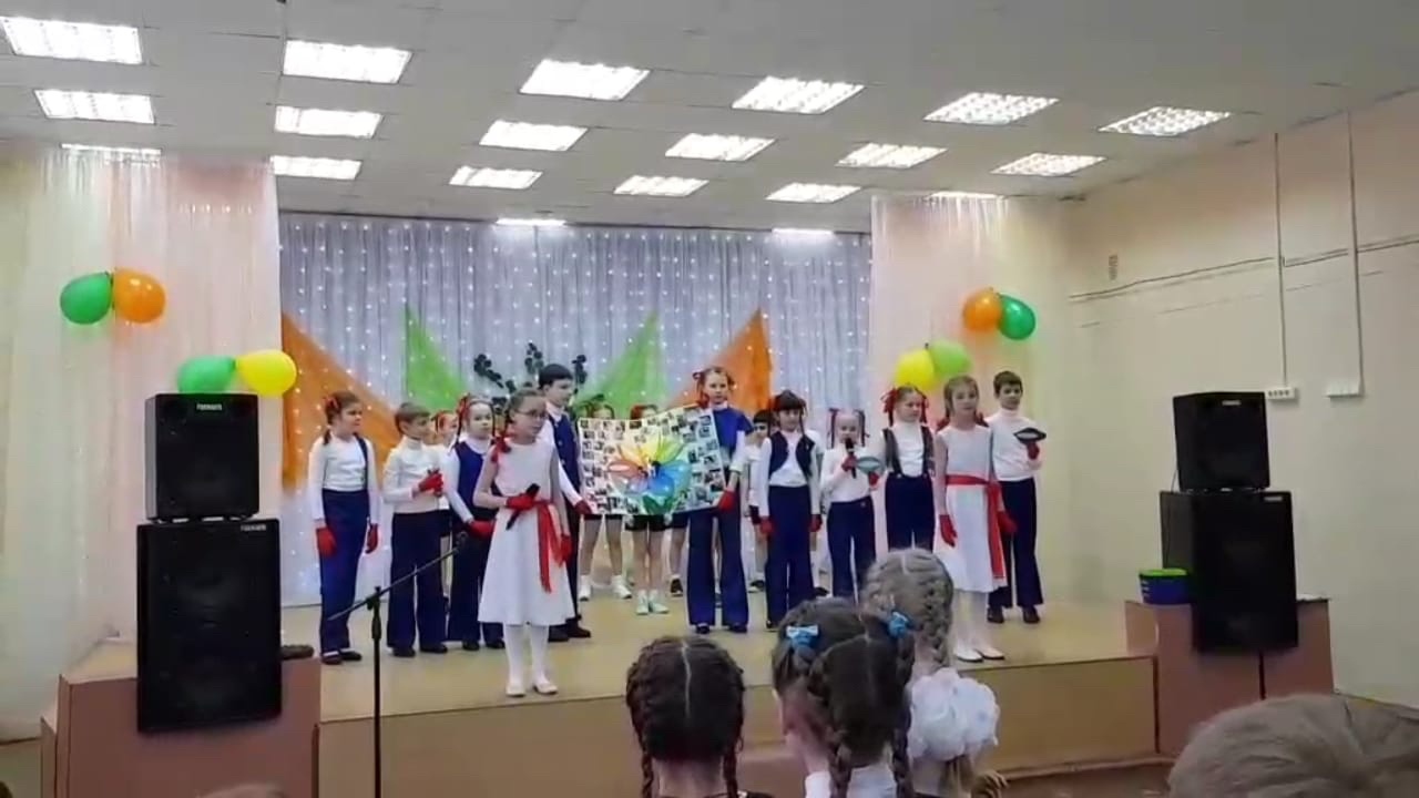 Двое детей встают с плакатом на середину сцены, остальные 7 человек стоят за ними с разноцветными лепестками.