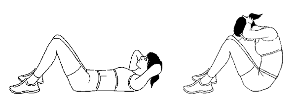 Поднимание туловища из положения лежа выполняется из ИП: лежа на спине на гимнастическом мате, руки за головой, лопатки касаются мата, ноги согнуты в коленях под прямым углом, ступни прижаты партнером к полу.