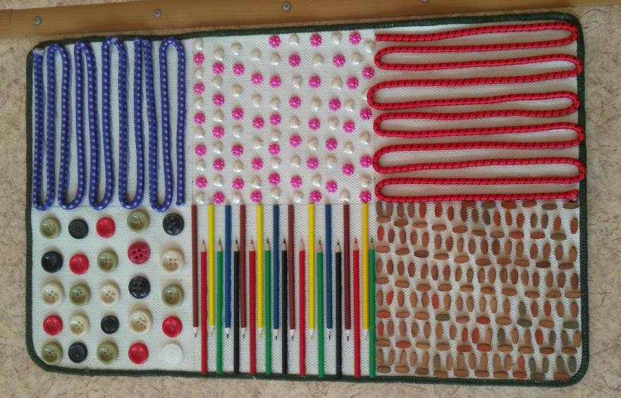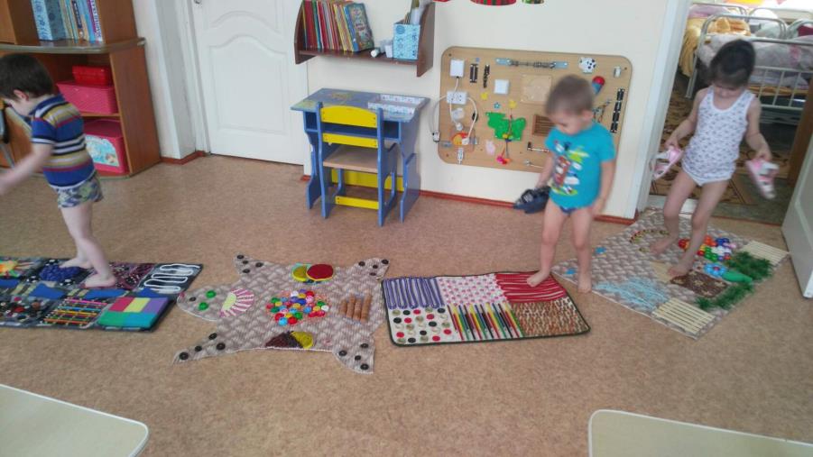 Во многих детских садах используются дорожки с нашитыми на них разного рода материалами, пуговицами, бусинами и т. д.