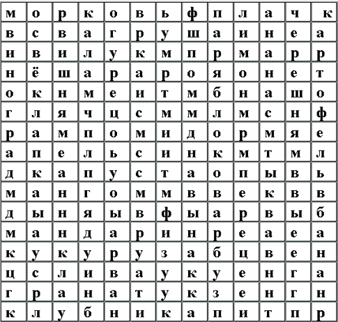 В кроссворде зашифрованы названия фруктов, овощей и ягод. Найдите и з