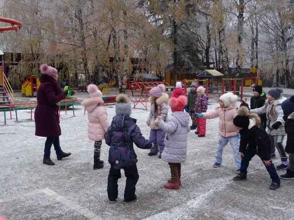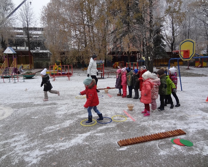 мственной нагрузкой, то прогулку начинаем с подвижной игры, если предшествовала динамическая деятельность (физкультурная, музыкальная), то игру организуем в середине прогулки. Побуждаем активно двигаться малоподвижных ребят, которые во время прогулки предпочитают спокойные игры. Наши дети любят играть в игры: «Мы весёлые ребята», «Третий лишний», «Ручейки и озера», «Баба Яга», «Затейники», «Удочка», «Охотники и зайцы», «Бездомный заяц», «Попади в обруч» и другие. Также ежедневно на прогулке дети играют в подвижные игры с различными видами движений (бегом, прыжками, метанием, лазанием)