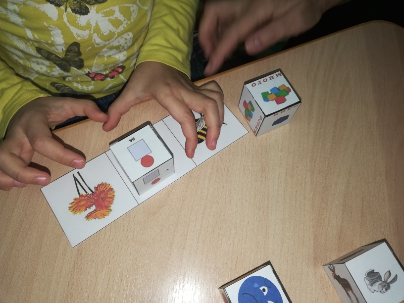 - развитие умения с помощью кубиков понимать и составлять предложения;