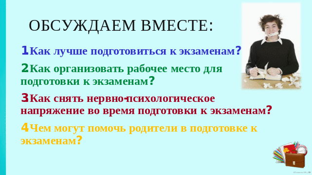 Цель нашей встречи – помочь нашим детям успешно подготовиться к экзаменам. Предлагаю обсудить вместе следующие вопросы: