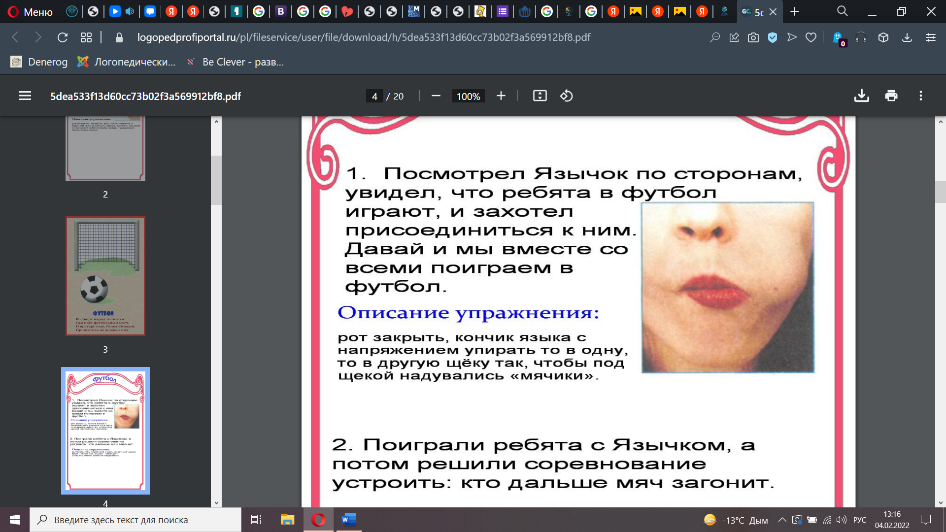 Рот закрыт. Язык попеременно упирается в правую и левую щеки, оставаясь в каждом положении по 3-5 секунд.:
