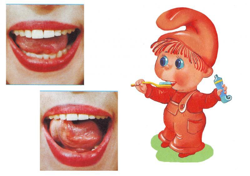 «Чистим верхние зубы» Улыбнуться, приоткрыть рот, показать зубы и широким языком провести с наружной стороны верхних зубов, имитируя чистящие движения зубной щетки. Также «чистим нижние зубы». Выполнять каждое упражнение по 3-5 раз.