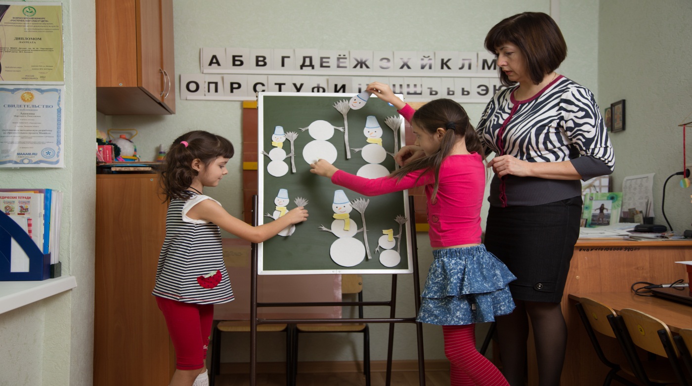 Логопед: Дети, пройдите к магнитной доске, возьмите по одному конверту и попробуйте сделать каждый своего снеговика.