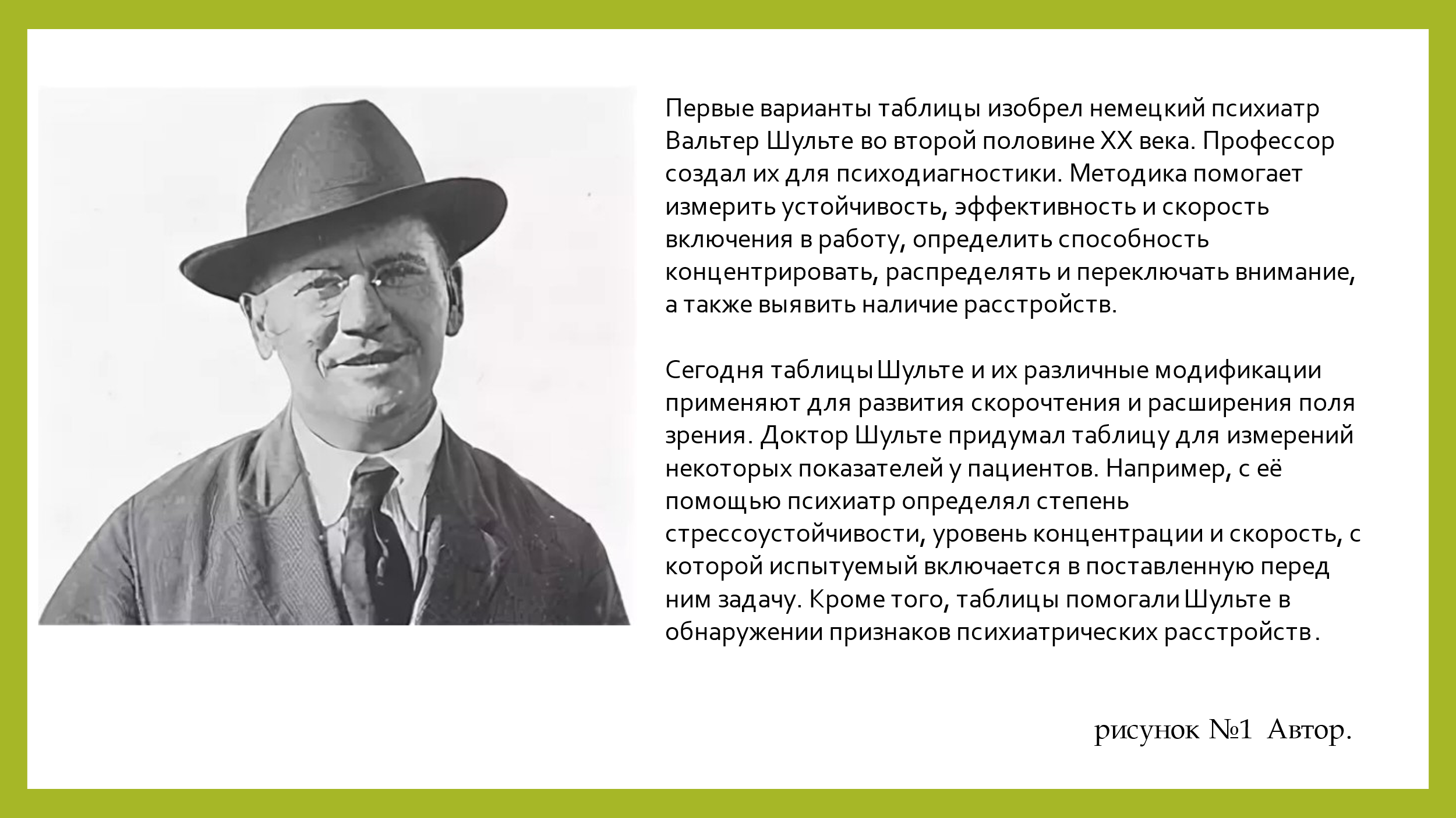 Несмотря на то, что таблицы Шульте были разработаны ещё в 1920-х годах, их использование в современной практике обучения детей с особыми образовательными потребностями продолжает оставаться актуальным и востребованным. С помощью таблиц со случайно расположенными цифрами, профессор психиатрии Вальтер Шульте определял степень стрессоустойчивости, уровень концентрации и скорость, с которой пациент включается в поставленную перед ним задачу (рис.1).