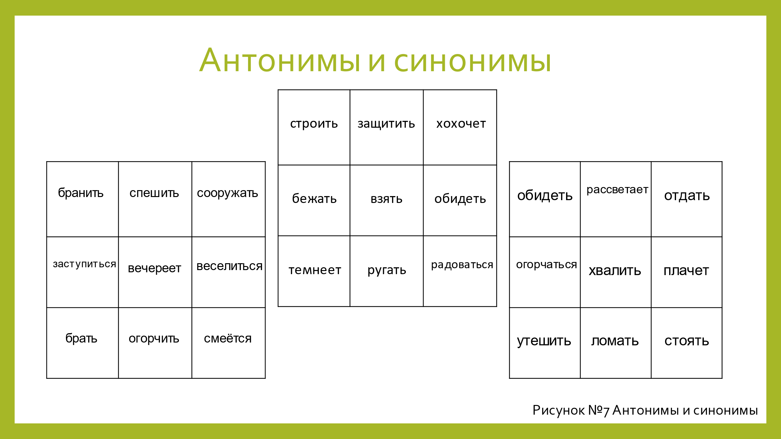 Усложняем таблицу (рис.7), и развитие активного словаря значительно повышается. Составляем словосочетание со словом из центральной таблицы и одновременно находим в соседних таблицах синонимы и антонимы (строить дом, сооружать дом, ломать дом). Закрепляем учебные термины.
