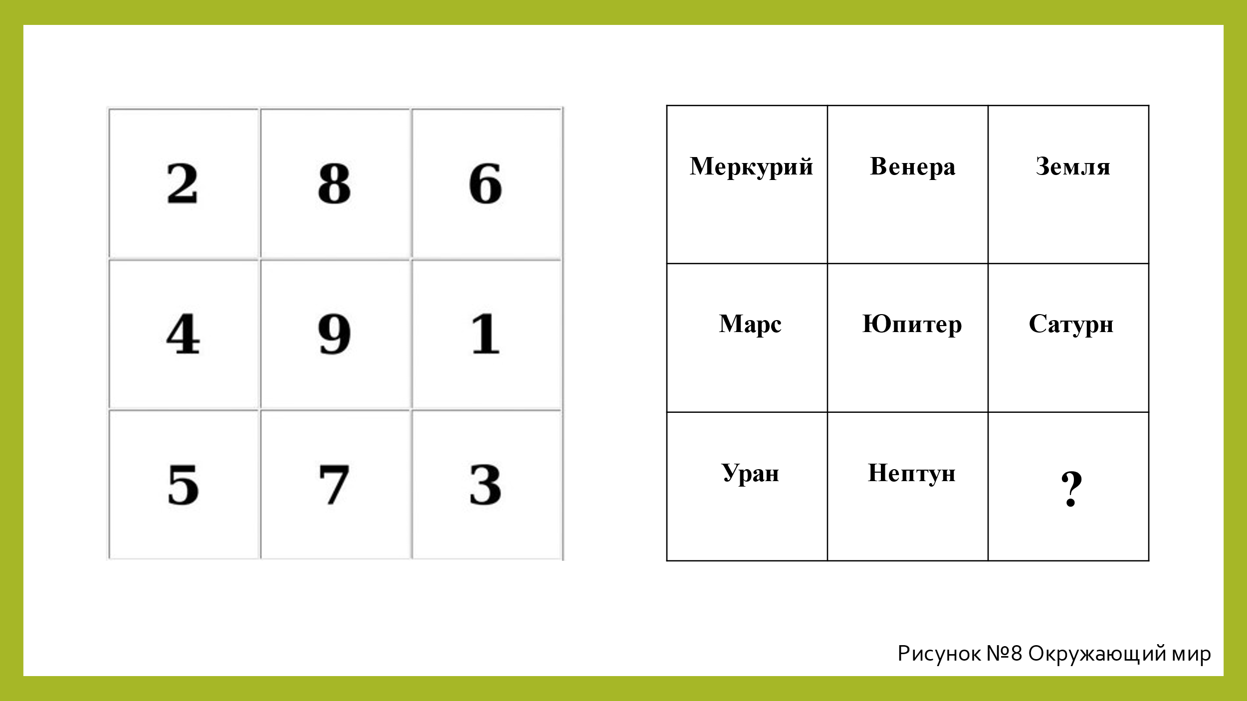 - убери таблицу и назови число, которое находилось по середине, находилось рядом с числом 6, вспомни, где находилась цифра 2;